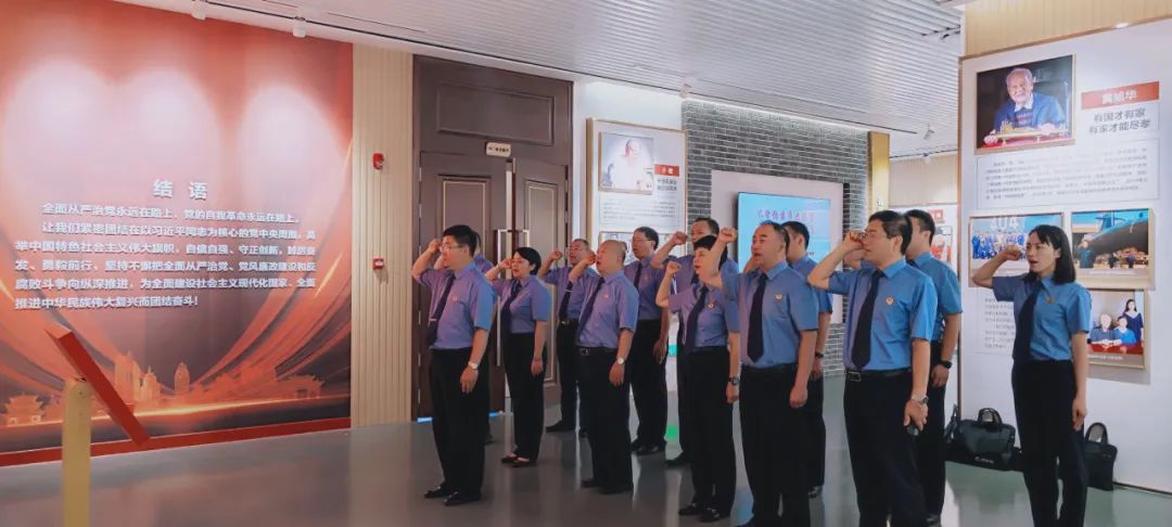 在讲解员的引导下,大家参观了“警示篇·以案为鉴,警钟长鸣”“防治篇·纪法铁规,敬畏知止”“铸魂篇·坚守信仰,永葆本色”三个主题展厅,通过听讲解、看展板、观看视频等方式,接受警示教育,深刻领会了“不敢腐、不能腐、不想腐”三位一体的工作理念。违纪违法人员的惨痛教训警醒大家,要以贪腐人员为前车之鉴,常怀律己之心,常思贪欲之害,时刻紧绷廉洁之弦。最后,党员们集体重温了入党誓词,通过庄严的入党誓词夯实清正廉洁思想根基。