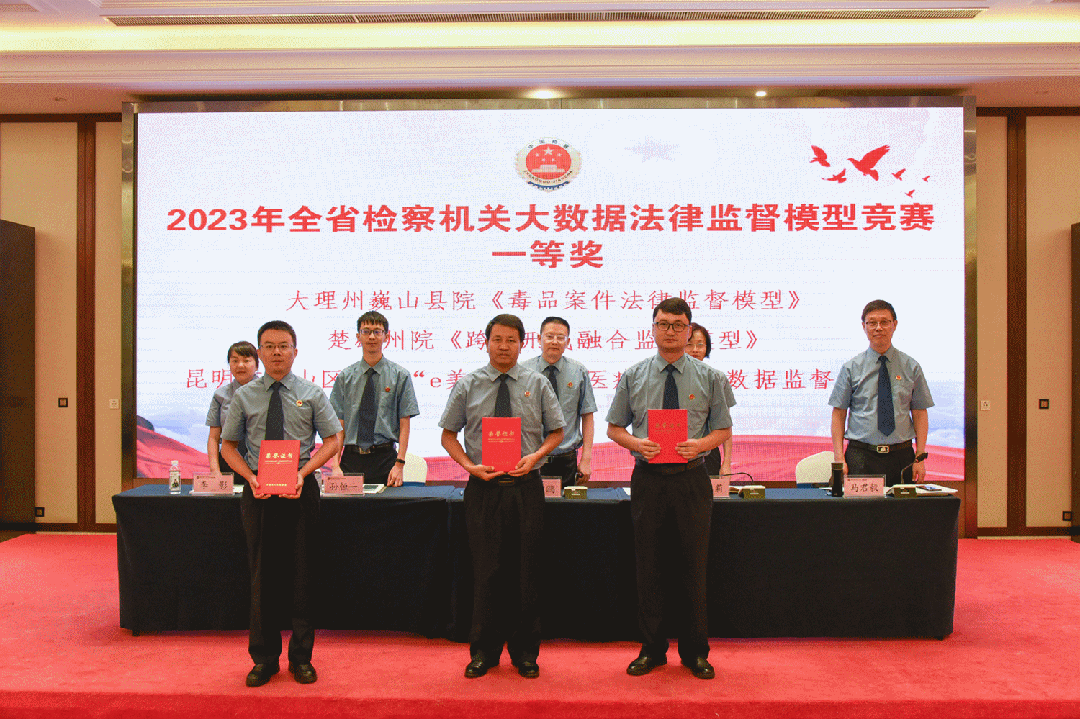 竞赛总结会上宣读了《关于2023年全省检察机关大数据法律监督模型竞赛结果的通报》,经过初评、复评,大理州巍山县检察院“毒品案件法律监督模型”,楚雄州检察院“跨省刑民融合监督模型”,昆明市西山区检察院“‘e’美互联网医疗美容大数据监督模型”等22个模型作品获奖。省检察院副检察长周智鸥,党组成员、政治部主任朱春莉为获奖作品所属单位颁发证书。