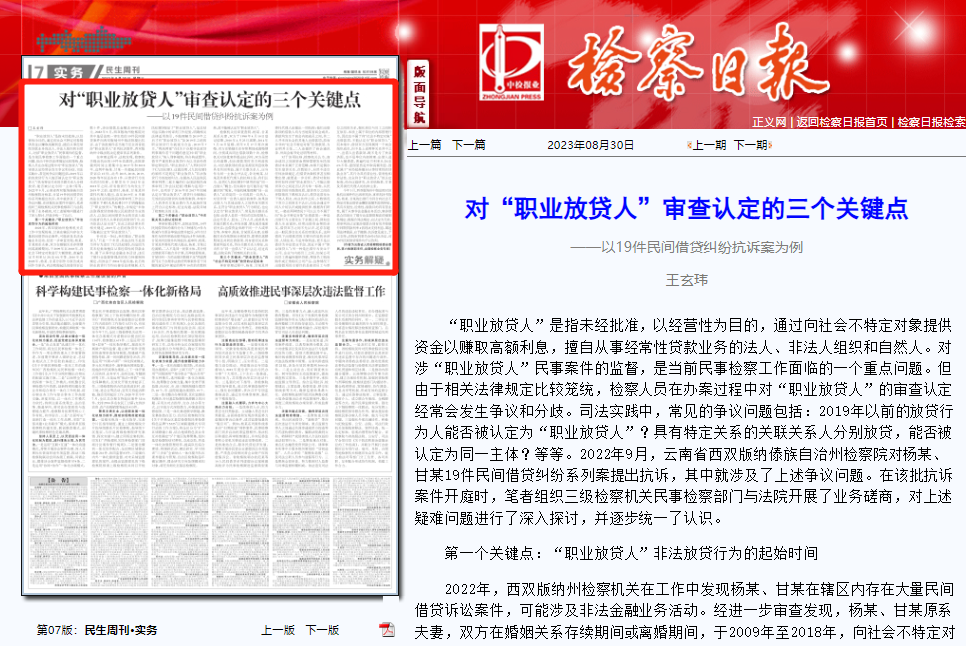 “职业放贷人”是指未经批准,以经营性为目的,通过向社会不特定对象提供资金以赚取高额利息,擅自从事经常性贷款业务的法人、非法人组织和自然人。对涉“职业放贷人”民事案件的监督,是当前民事检察工作面临的一个重点问题。但由于相关法律规定比较笼统,检察人员在办案过程中对“职业放贷人”的审查认定经常会发生争议和分歧。司法实践中,常见的争议问题包括:2019年以前的放贷行为人能否被认定为“职业放贷人”?具有特定关系的关联关系人分别放贷,能否被认定为同一主体?等等。2022年9月,云南省西双版纳傣族自治州检察院对杨某、甘某19件民间借贷纠纷系列案提出抗诉,其中就涉及了上述争议问题。在该批抗诉案件开庭时,笔者组织三级检察机关民事检察部门与法院开展了业务磋商,对上述疑难问题进行了深入探讨,并逐步统一了认识。