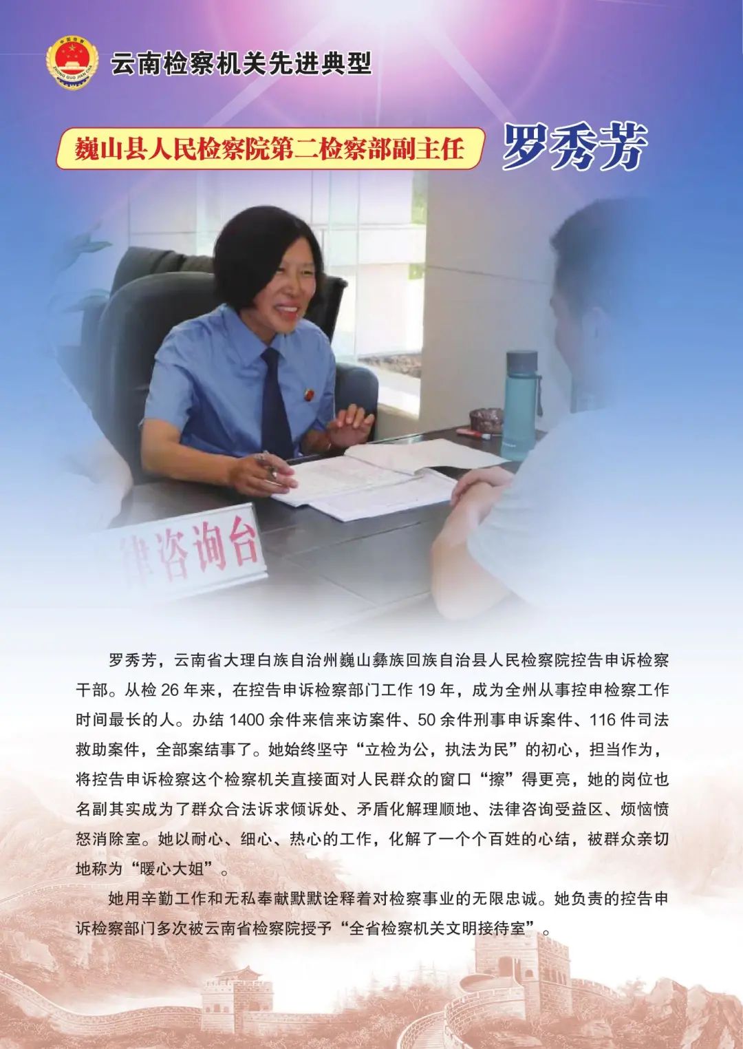 罗秀芳是大理州巍山县检察院的一名控告申诉检察人员,今年已51岁。从事检察工作26年,而她在控告申诉检察部门一干就是19年。从检26年来,她始终坚守“立检为公,执法为民”的初心,担当作为,将控告申诉检察这个检察机关直接面对人民群众的窗口“擦”得更亮,桥梁作用更牢,她的岗位也名副其实成了群众合法诉求倾诉处、矛盾化解理顺地、法律咨询受益区、烦恼愤怒消除室。她以耐心、细心、热心的工作,化解了一个个百姓的心结,被群众亲切地称为“知心姐姐”“暖心大姐”。