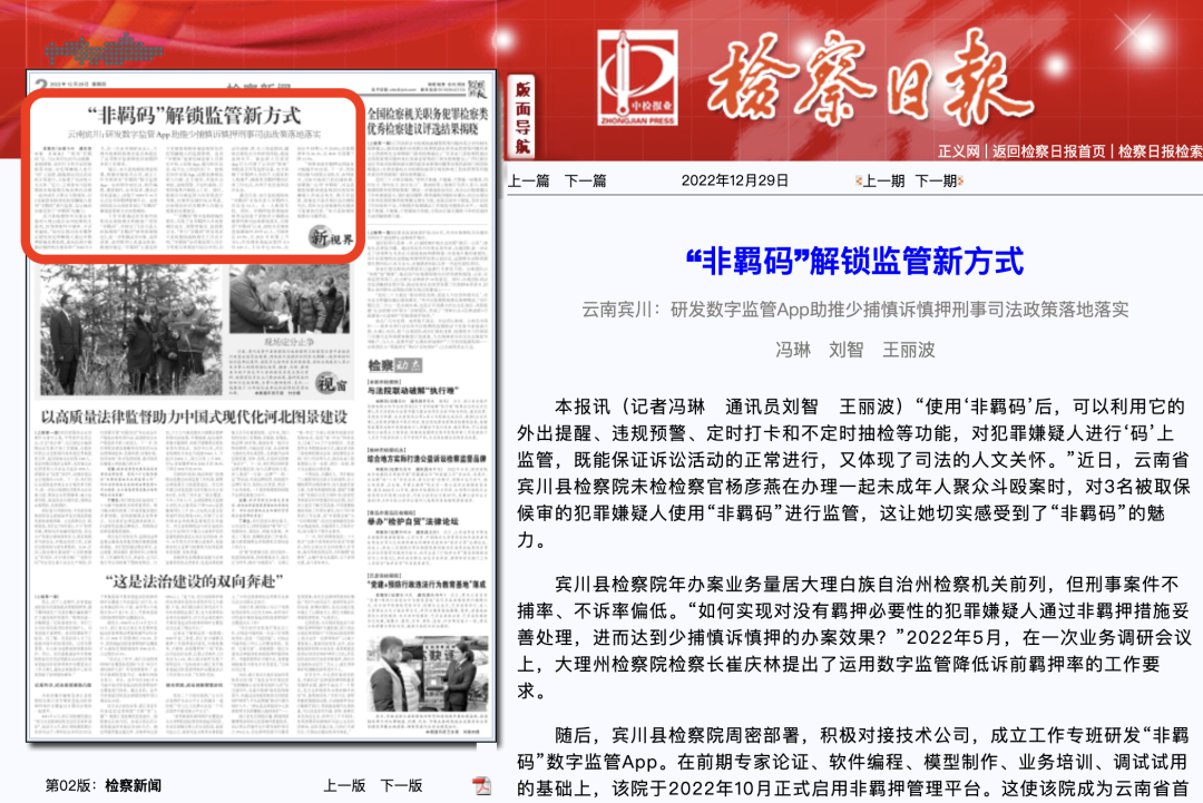 随后,宾川县检察院周密部署,积极对接技术公司,成立工作专班研发“非羁码”数字监管App。在前期专家论证、软件编程、模型制作、业务培训、调试试用的基础上,该院于2022年10月正式启用非羁押管理平台。这使该院成为云南省首家以“非羁码”解锁监管新方式的检察院。