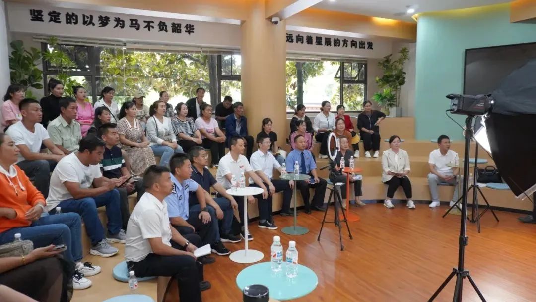 在金花姐姐“青蓝工作室”,共青团漾濞县委、县妇联、县司法局、县法院、县检察院、县公安局“六大保护团队”成员,化身为一个个“主播”,为学生家长合力开展一次法治家长会。