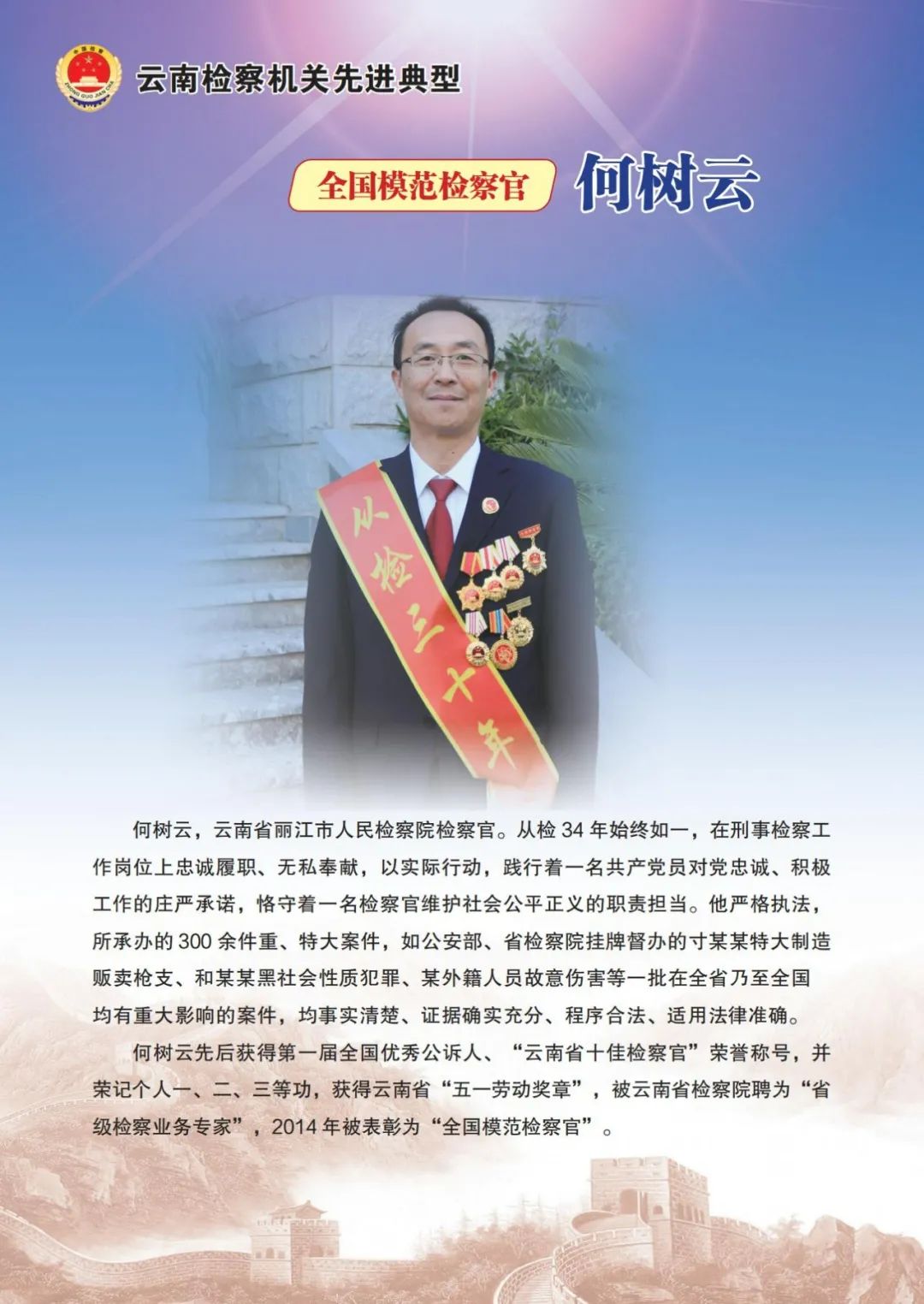 何树云,现任云南省丽江市检察院专职检察委员会委员,三级高级检察官。何树云自1987年7月从检以来,34年如一日,在刑事检察工作岗位上辛勤耕耘,忠诚履职、无私奉献、严格执法、公正司法,以实际行动,践行着一名共产党员对党忠诚、积极工作的庄严承诺,恪守着一名检察官维护社会公平正义的职责担当,在平凡的工作岗位作出了不平凡的业绩,为检察事业和人民群众利益做出了特殊的贡献。
