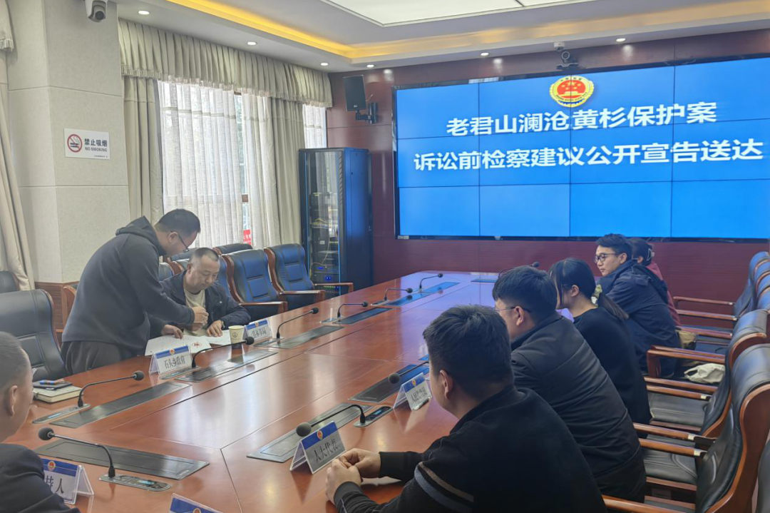 “澜沧黄杉”树生长在玉龙县“三江并流”世界自然遗产核心区老君山国家公园,是国家重点保护野生植物。近日,玉龙县检察院召开老君山澜沧黄杉保护案诉讼前检察建议公开宣告送达听证会,邀请玉龙县林业和草原局、石头乡政府、人大代表、人民监督员、听证员、“益心为公”云平台志愿者参加听证。