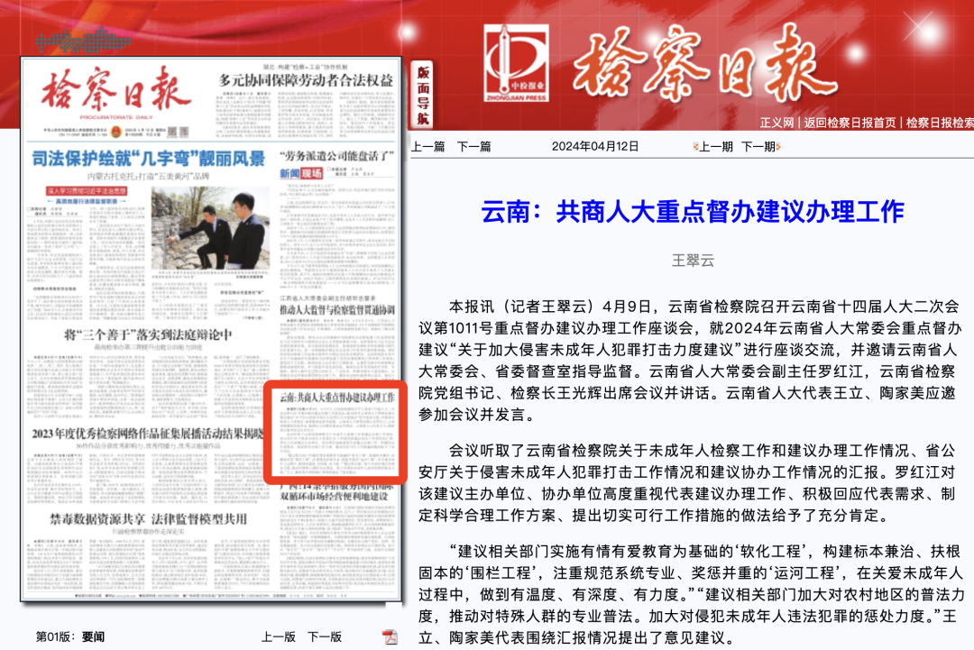 4月9日,云南省检察院召开云南省十四届人大二次会议第1011号重点督办建议办理工作座谈会,就2024年云南省人大常委会重点督办建议“关于加大侵害未成年人犯罪打击力度建议”进行座谈交流,并邀请云南省人大常委会、省委督查室指导监督。云南省人大常委会副主任罗红江,云南省检察院党组书记、检察长王光辉出席会议并讲话。云南省人大代表王立、陶家美应邀参加会议并发言。