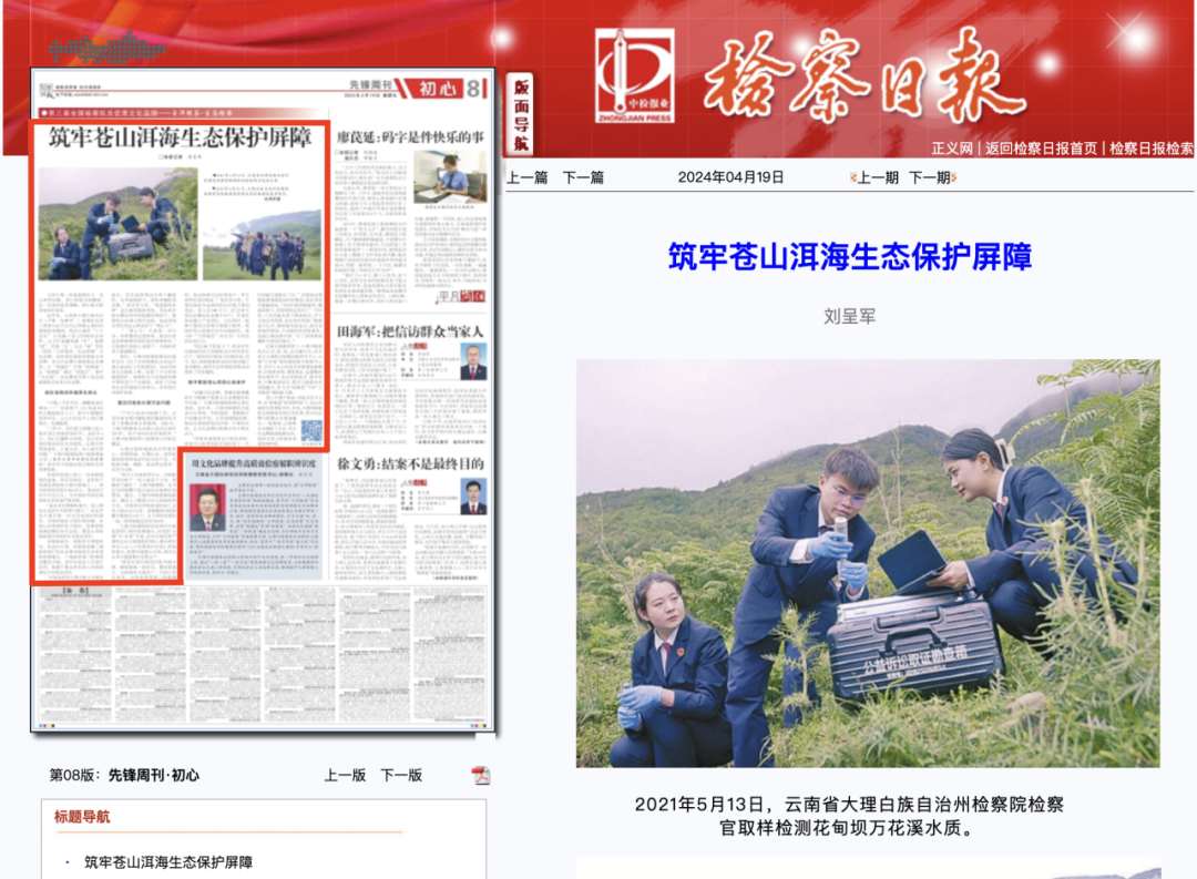 近年来,云南省大理白族自治州(下称“大理州”)检察机关深入贯彻习近平总书记考察云南时的重要讲话精神,把对云南的“三个定位”主动融入苍山洱海综合保护,全力打造融党建“红”、检察“蓝”、民族“白”、生态“绿”四色一体的“玉洱银苍·生态检察”文化品牌,坚持用办案质效塑造文化品牌,用文化品牌引领检察业务增效,以“党建红”引领“检察蓝”,让“检察蓝”顺应“民族白”、保护“生态绿”。该品牌获评第三届全国检察机关优秀文化品牌。